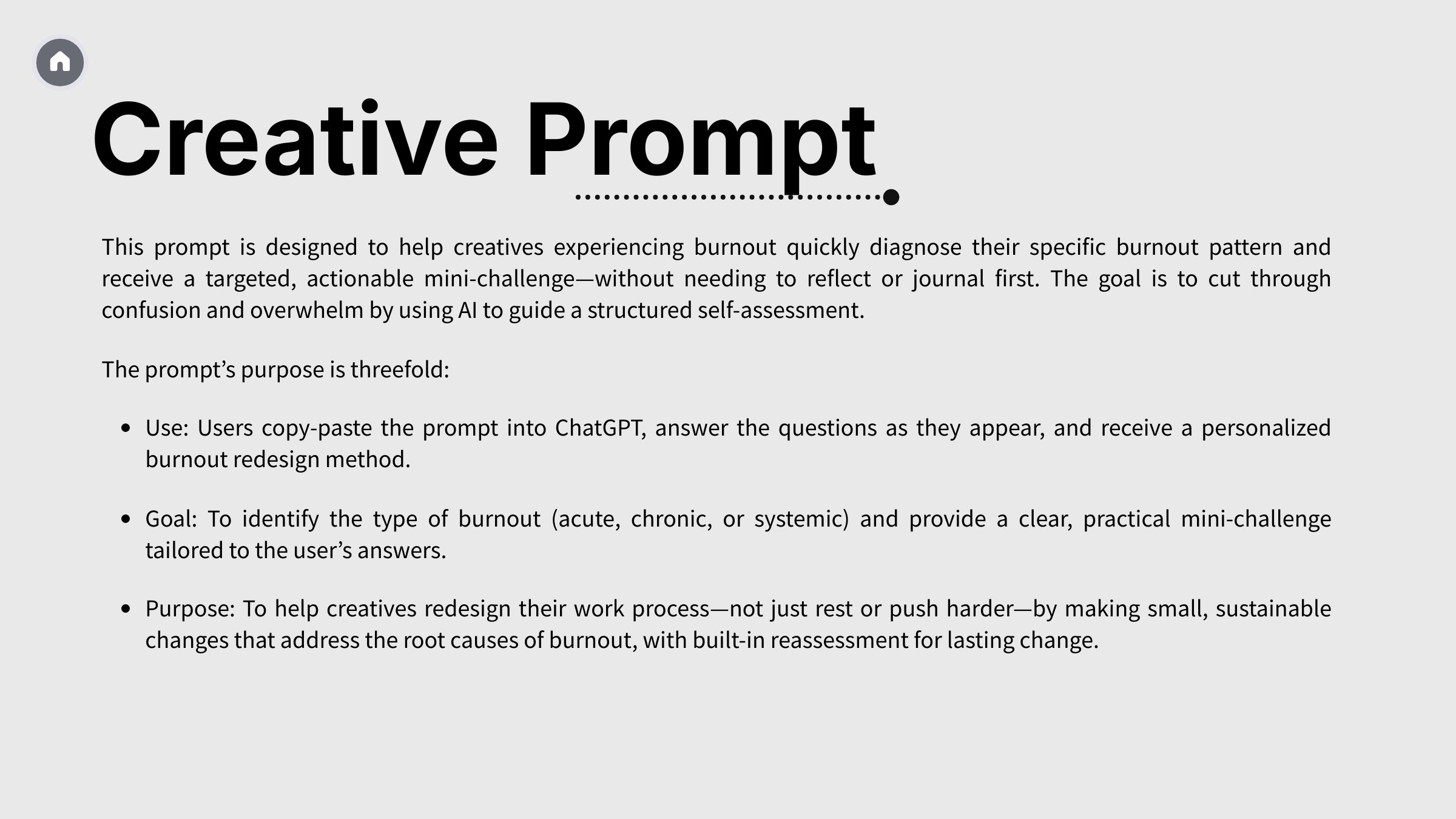 The core idea is simple: most creative stress does not come from a lack of effort, but from misaligned systems, expectations, or roles. This prompt helps surface those underlying patterns by asking targeted questions one at a time, allowing you to respond honestly without needing to prepare or plan in advance.