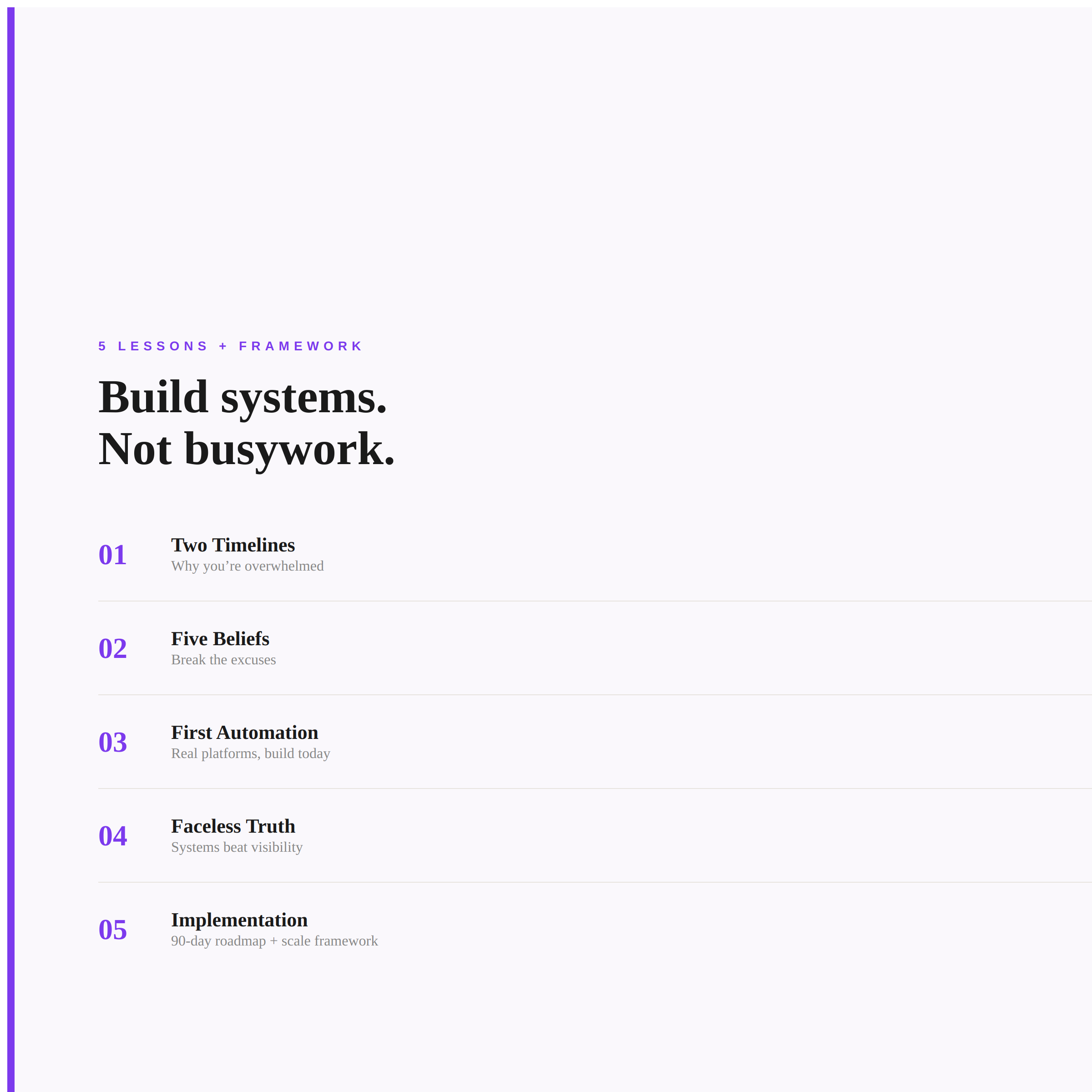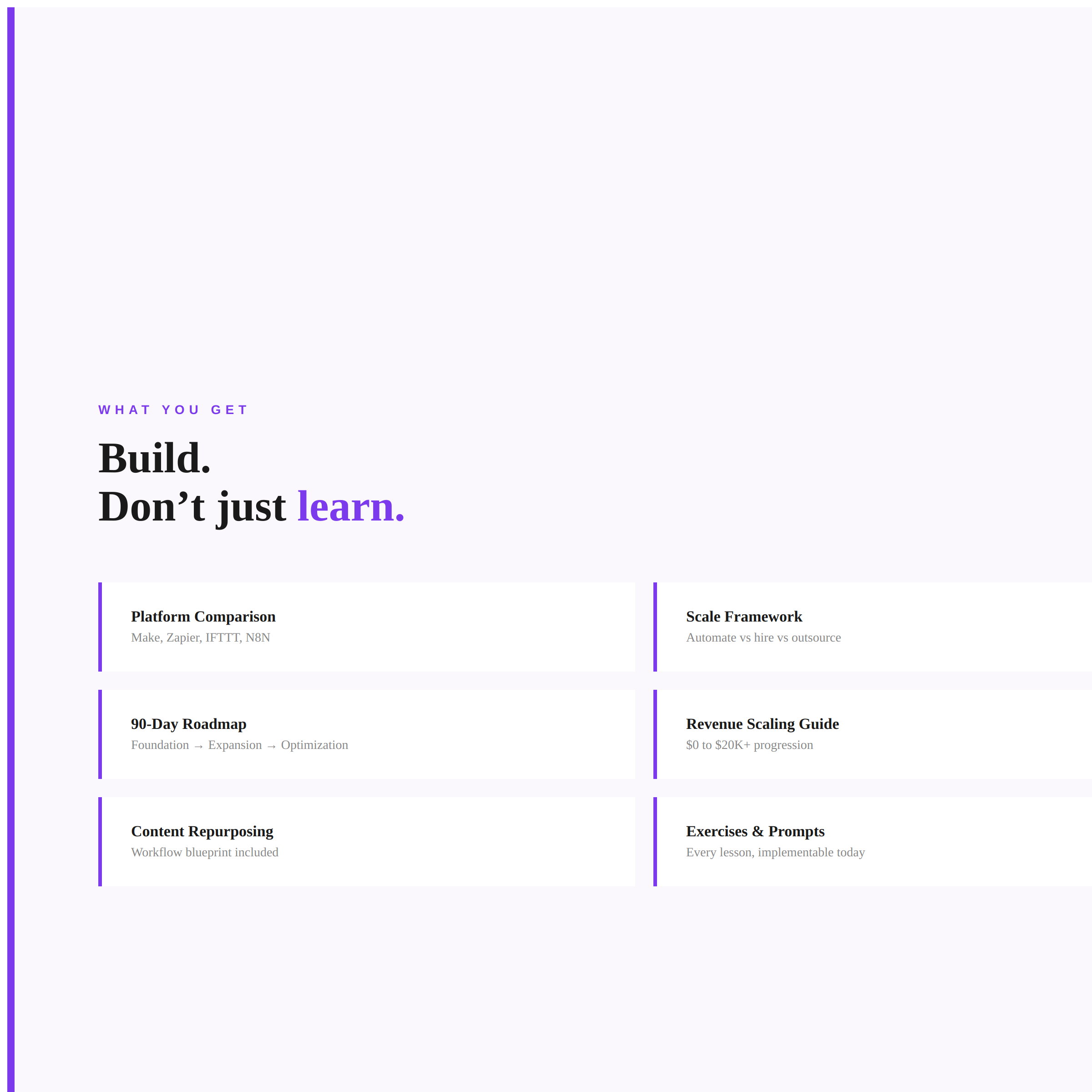 Format: Five lessons with exercises and prompts, plus Scale Decision Framework. Build as you learn.