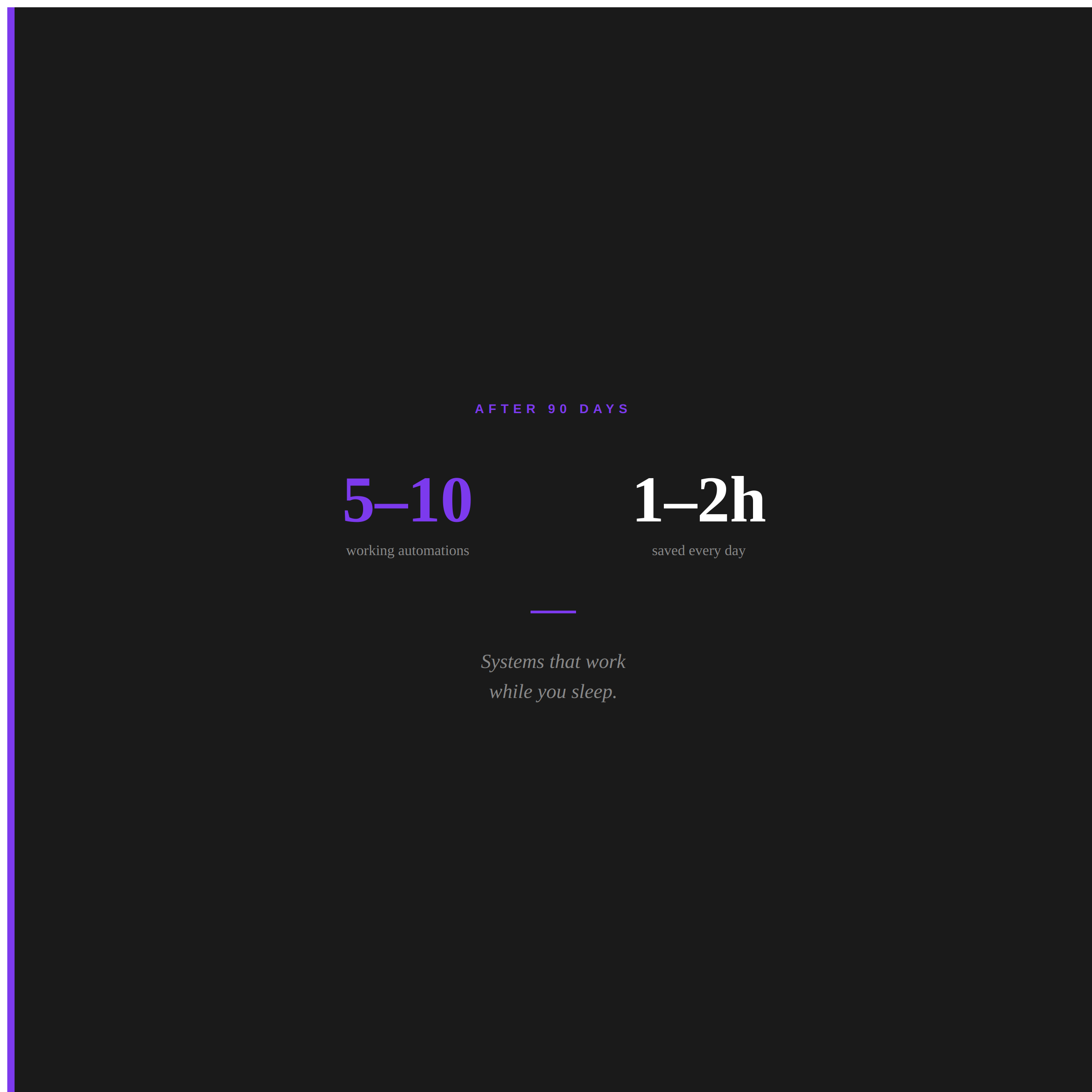 Outcome: 5–10 working automations, 1–2 hours saved daily, documented processes, clear ROI, and a scaling roadmap for what comes next.