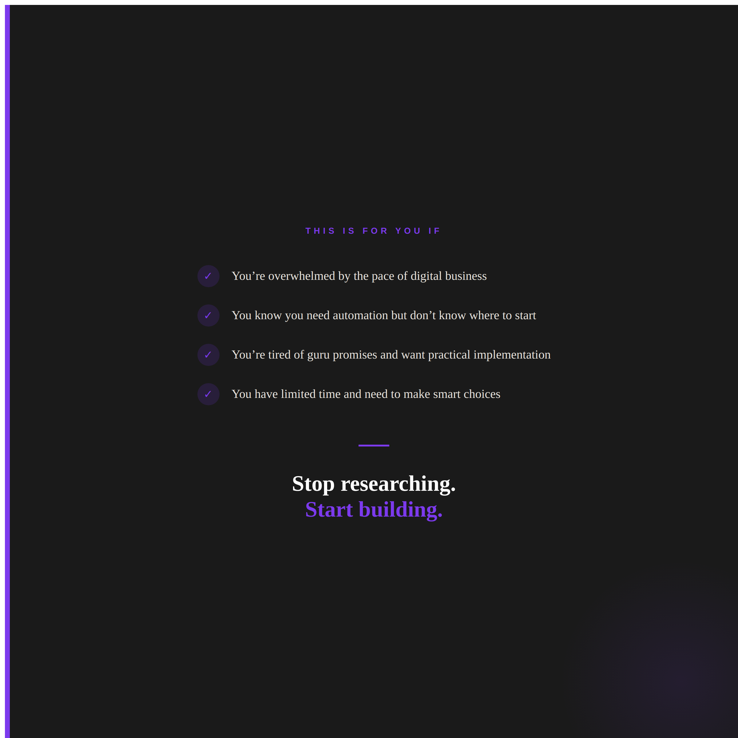 Creative leaders, entrepreneurs, founders, and business owners whose creative vision is being suffocated by operational chaos. People who feel overwhelmed by digital demands but know they need to adapt. High performers who are tired of guru promises and want practical implementation.