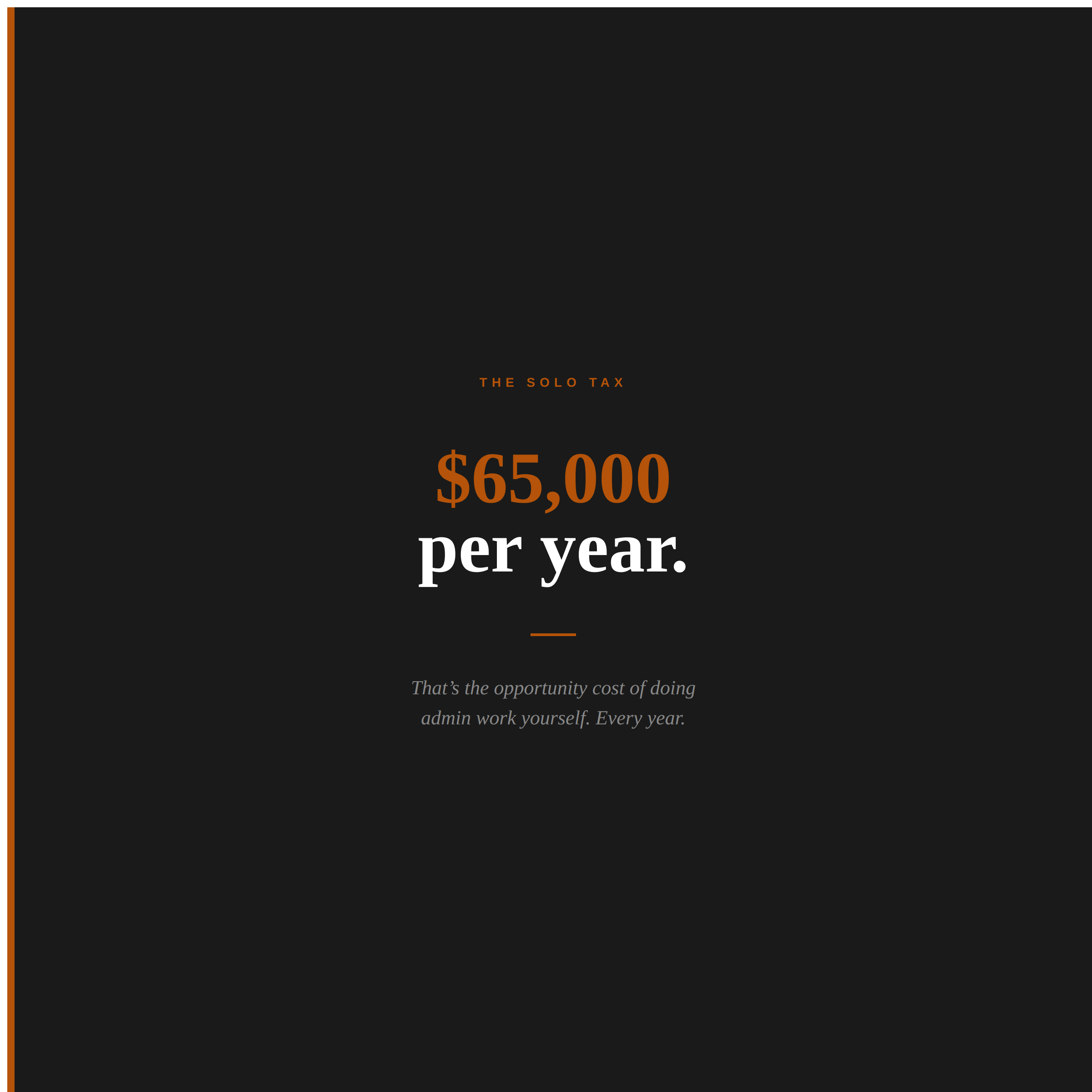 Seven specific costs: opportunity ($65K/year in lost value), energy drain, quality decline, growth ceiling ($312K cap), burnout risk, innovation stall, exit barrier. Calculate your personal solo tax.
