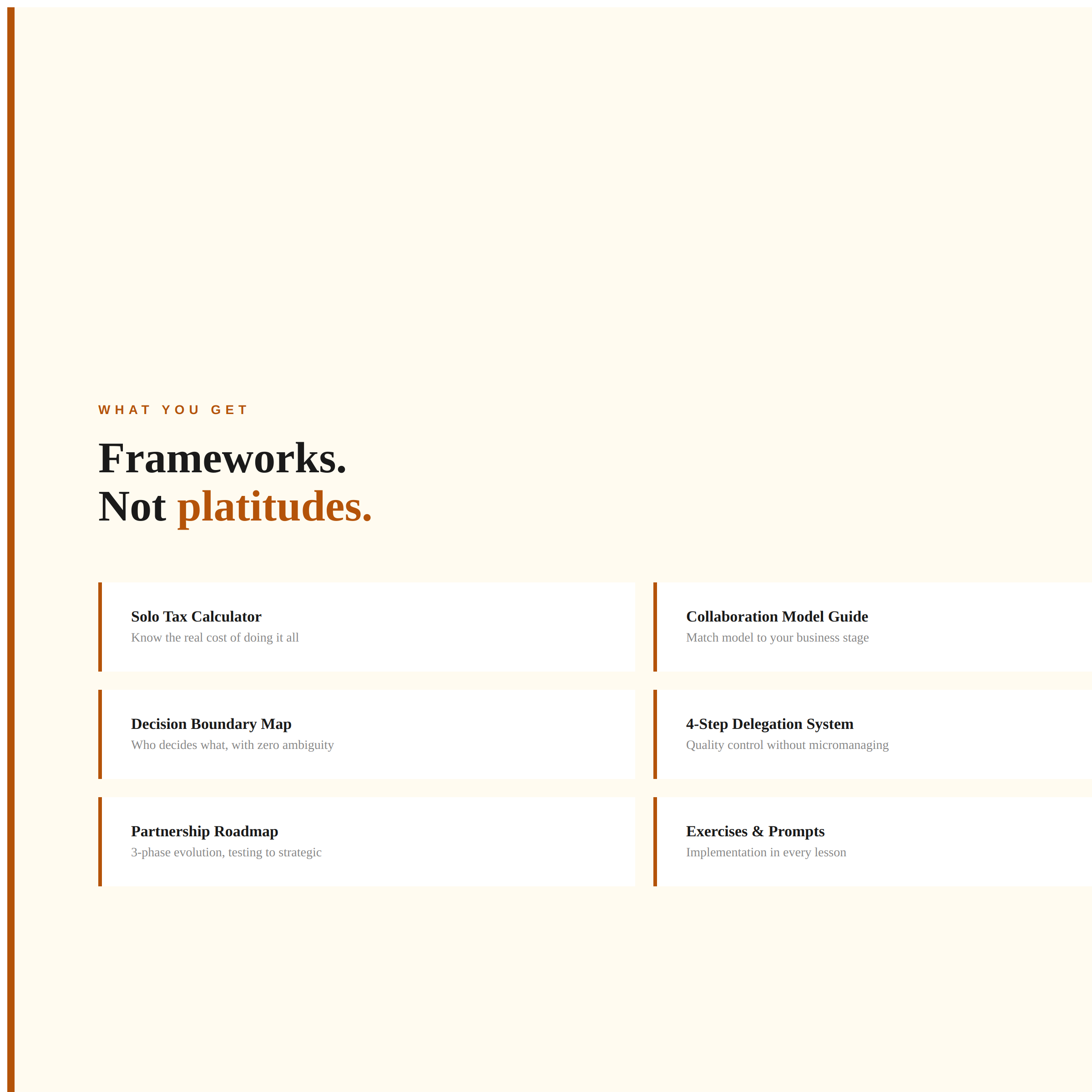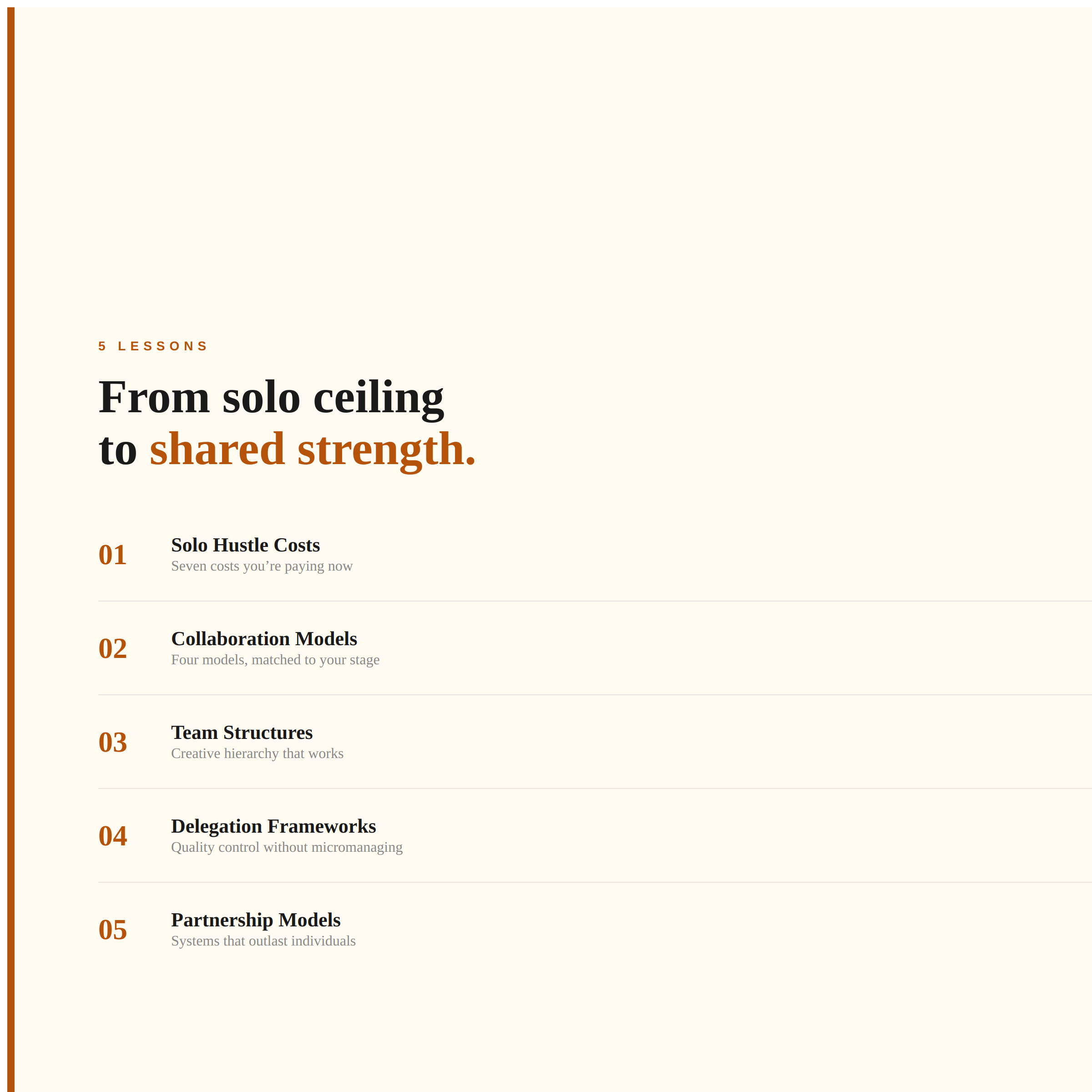 Shared Responsibility for Creative Leaders is a five-lesson implementation course that takes you from solo operator to sustainable collaborator. You’ll calculate the real cost of doing everything yourself, choose the right collaboration model, build team structures that preserve creative control, master delegation without losing quality, and create partnership systems that last.