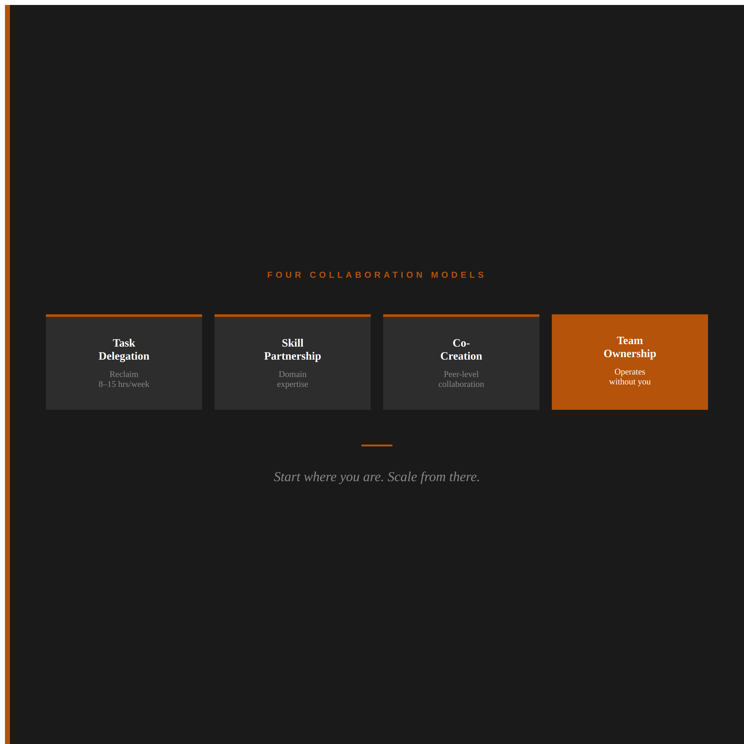Task delegation, skill partnership, co-creation, team ownership. Matched to your business stage, budget, and readiness. Start where you are, not where you wish you were.