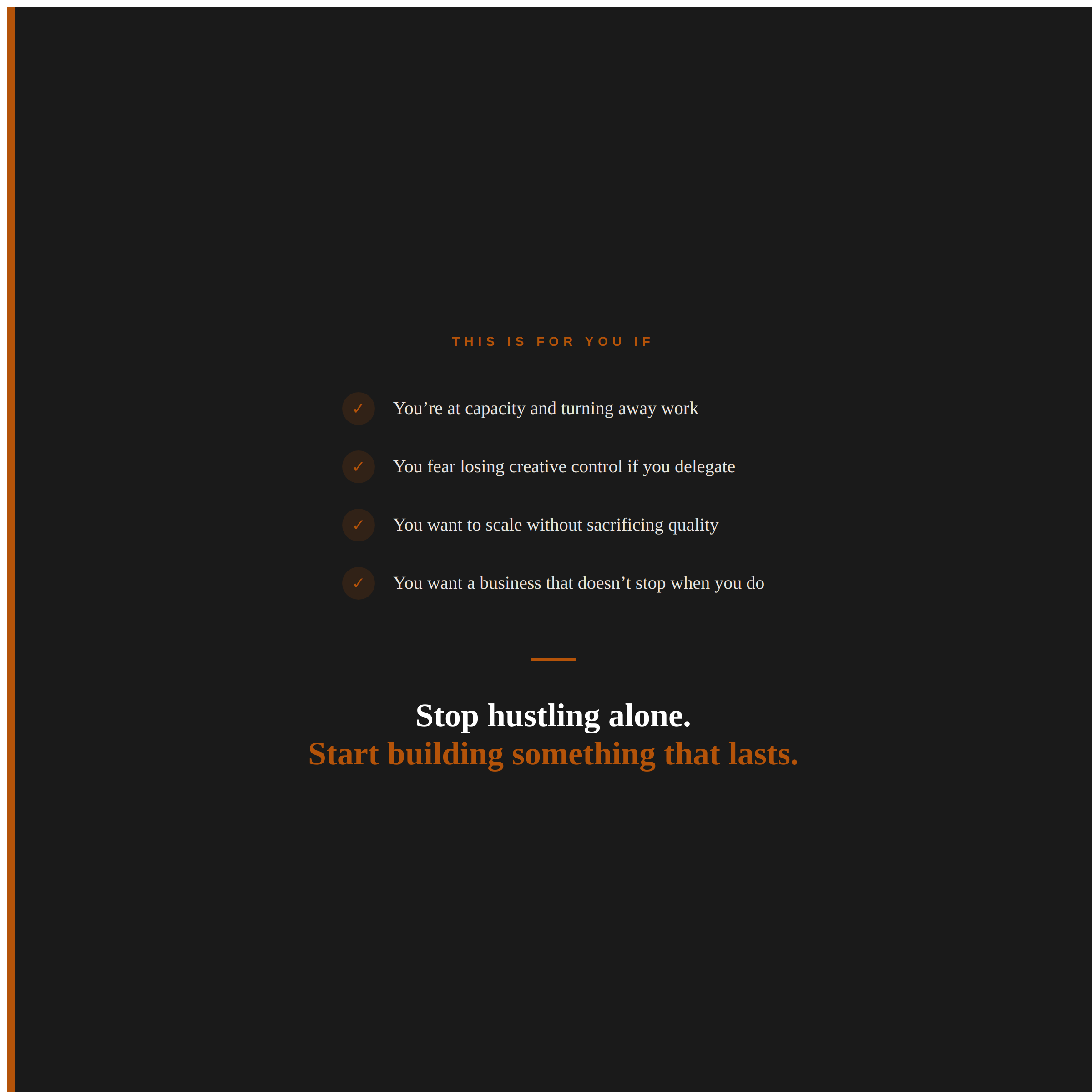 Creative leaders at capacity. Artists and entrepreneurs burning out from doing everything. Founders whose creative vision is being suffocated by operational overload. Anyone whose business growth is capped by solo operation — and who’s ready to change that.